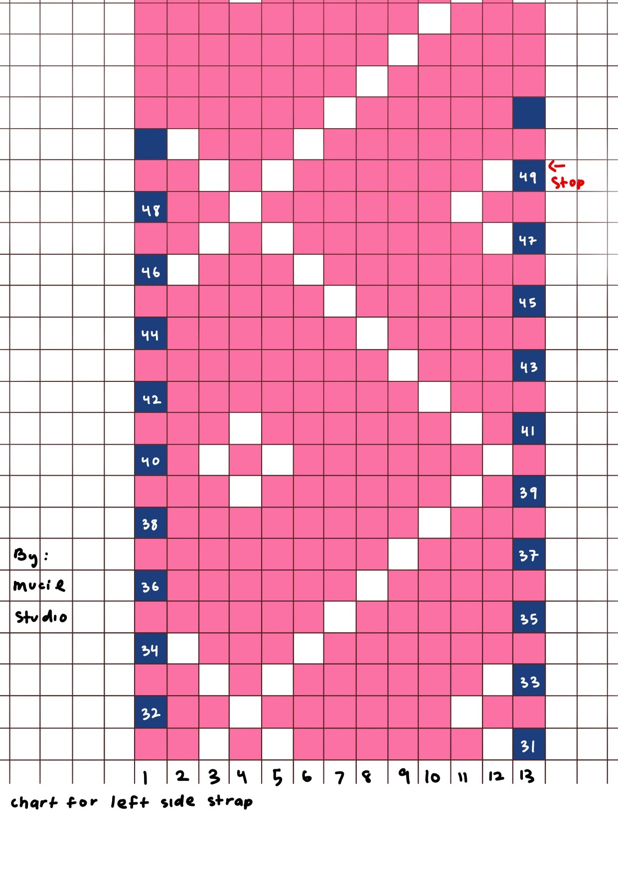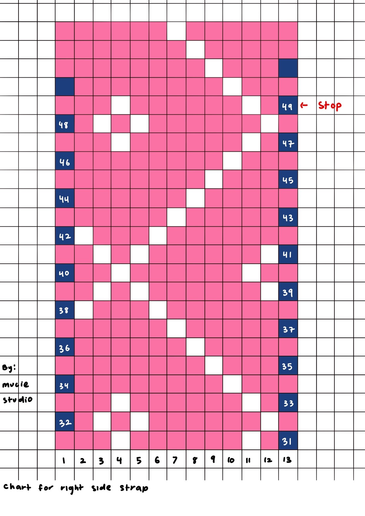 You will stop making any Dc2tog. Now you will just keep making the pattern to lengthen the strap. You can make the strap longer than I did (I only did until R49) but you will have to figure out the diamond pattern yourself using the diamond chart pattern pdf that I gave you at the top (Link to download the chart for R1 - 18).